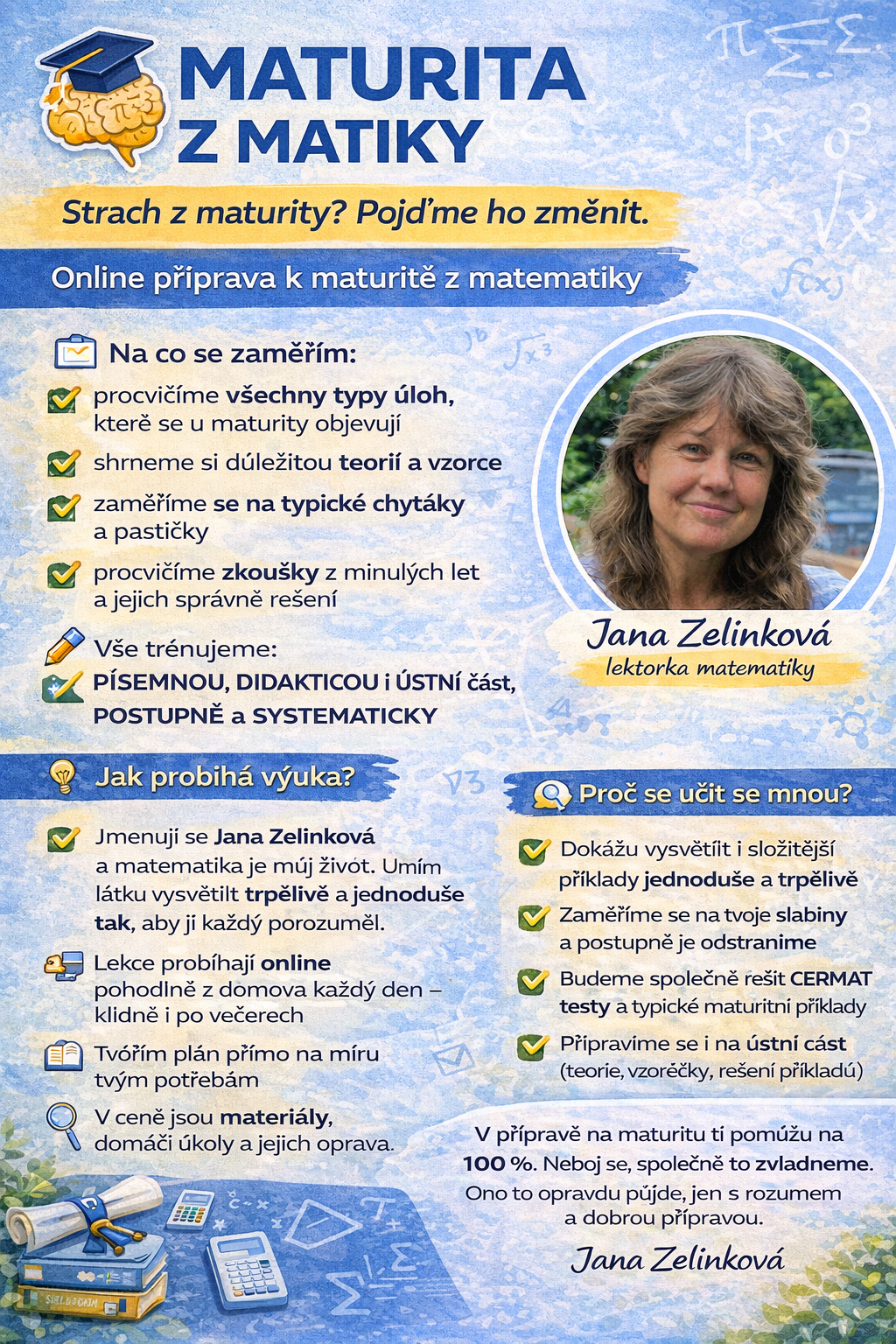 Maturita z matematiky je závěrečnou zkouškou středního vzdělání a vyžaduje pochopení principů, systematický přístup a schopnost samostatného řešení úloh . Připravuji studenty tak, aby zvládli všechny části maturitní zkoušky a získali jistotu ve své práci.