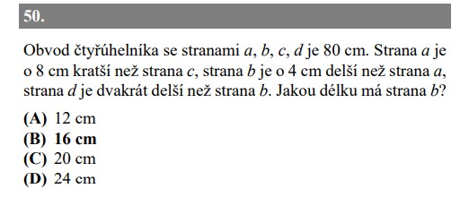 Obvod čtyřúhelníka se stranami a, b, c, d je 80 cm. Strana a je o 8 cm kratší než strana c, strana b je o 4 cm delší než strana a, strana d je dvakrát delší než strana b. Jakou délku má strana b? (A) 12 cm (B) 16 cm (C) 20 cm (D) 24 cm