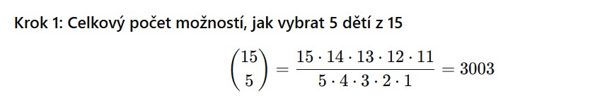Na letní tábor se přihlásilo 15 dětí, z toho 9 chlapců a 6 dívek. Vedoucí náhodně vybírá 5 dětí do soutěžního týmu. Jaká je pravděpodobnost že v týmu budou alespoň 3 chlapci.