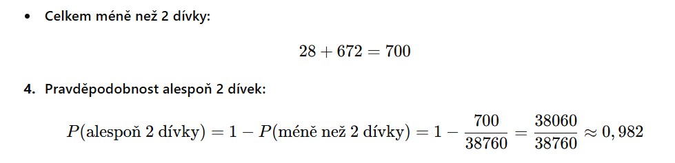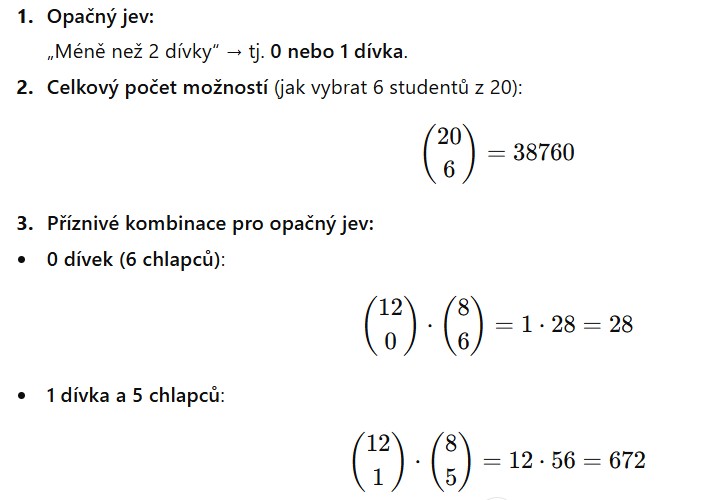 Do finále matematické soutěže postoupilo 20 studentů, z toho 12 dívek a 8 chlapců. Porota náhodně vybírá 6 studentů, kteří budou prezentovat svá řešení. Jaká je pravděpodobnost, že mezi vybranými budou alespoň 2 dívky.