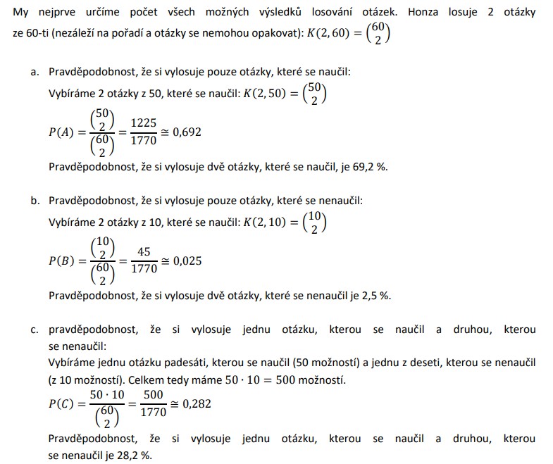 Honza se ze šedesáti maturitních otázek 10 nenaučil. Při zkoušce si losuje dvě otázky. a. Určete pravděpodobnost jevu A, že si vylosuje pouze otázky, které se naučil. b. Určete pravděpodobnost jevu B, že si vylosuje pouze otázky, které se nenaučil. c. Určete pravděpodobnost jevu C, že si vylosuje jednu otázku, kterou se naučil a druhou, kterou se nenaučil.