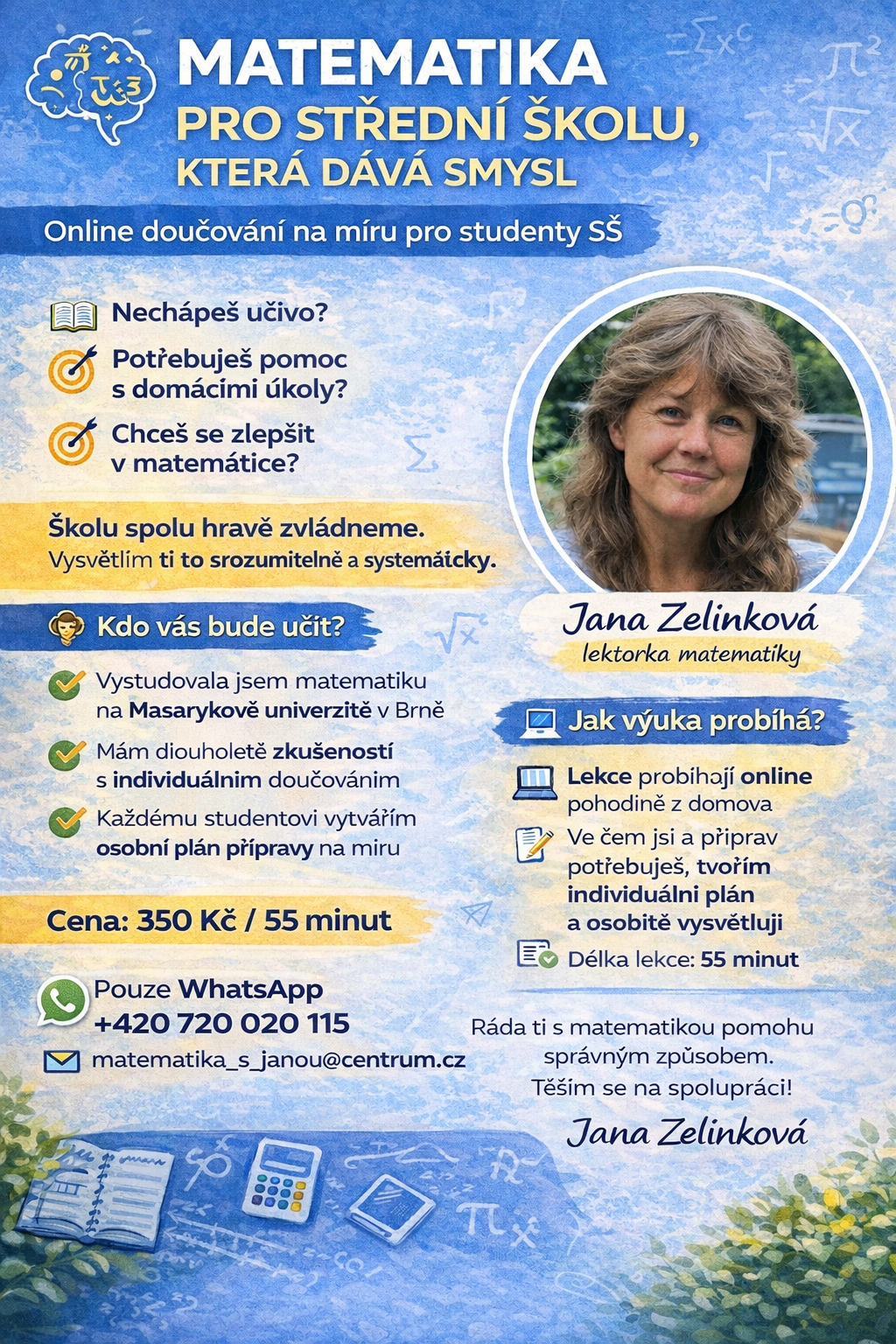 Žádné rychlé "nadiktování postupu". Všechno krok za krokem, s důrazem na pochopení. Když víš proč něco počítáš určitým způsobem, přestane být matematika jen změť vzorců.