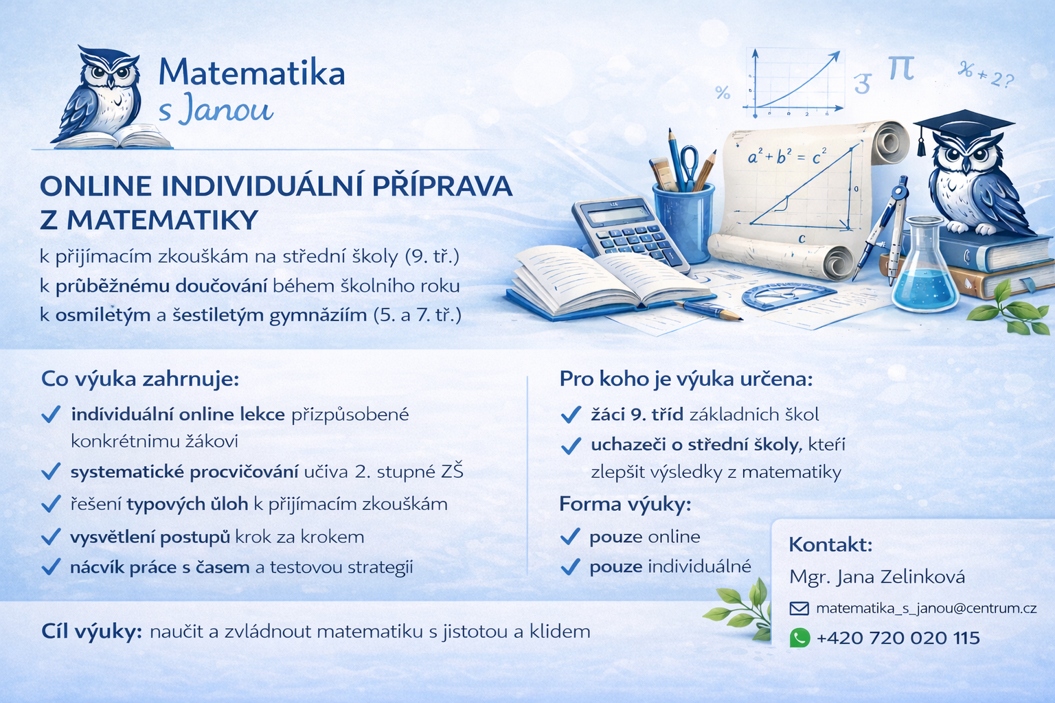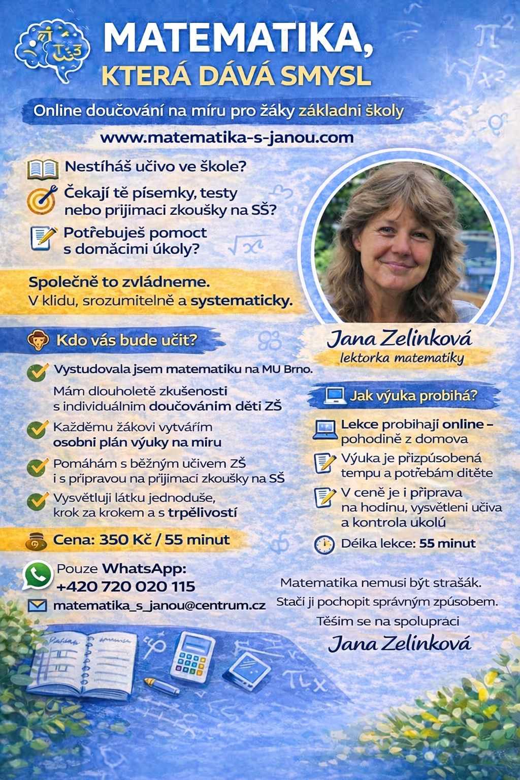 Matematiku vysvětluji jednoduše, lidsky a s úsměvem. Žádné složité poučky bez vysvětlení – všechno si ukážeme na příkladech, obrázcích a situacích z běžného života.
